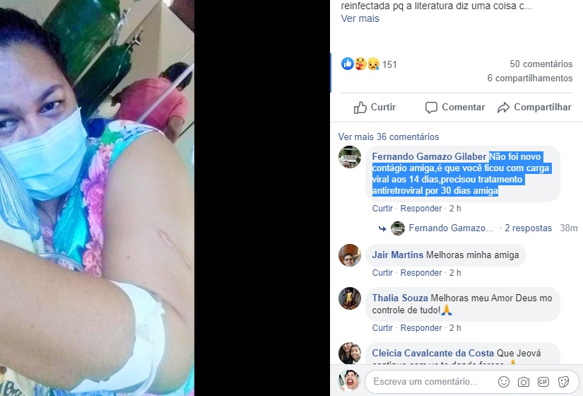 “Não foi novo contágio amiga, é que você ficou com carga viral aos 14 dias, precisou tratamento antirretroviral por 30 dias amiga” disse um internauta na postagem de Marques