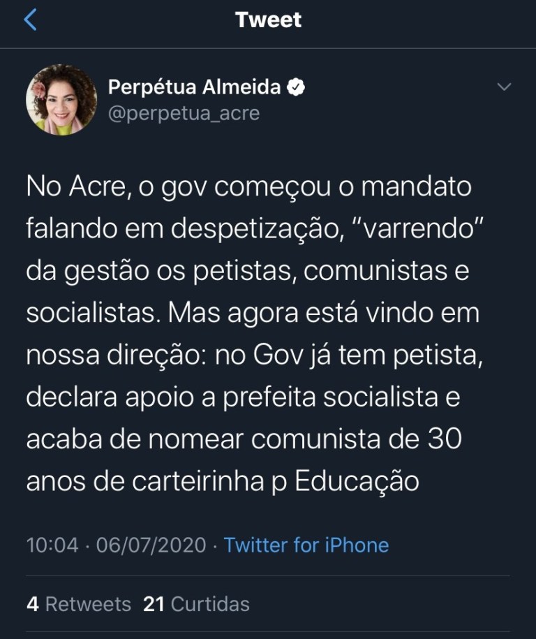 A deputada federal Perpétua Almeida (PC do B) não ficou quieta com a nomeação do ex-camarada Moisés Diniz para compor a equipe do governo Gladson Cameli.