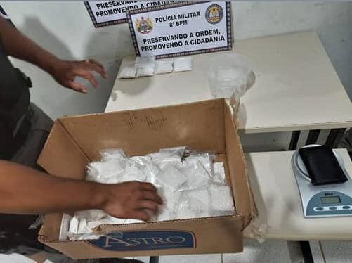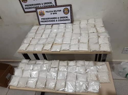 Após o procedimento de abordagem foi encontrado 93 pacotes de uma substância de cor esbranquiçada aparentando ser cocaína no interior da caixa.