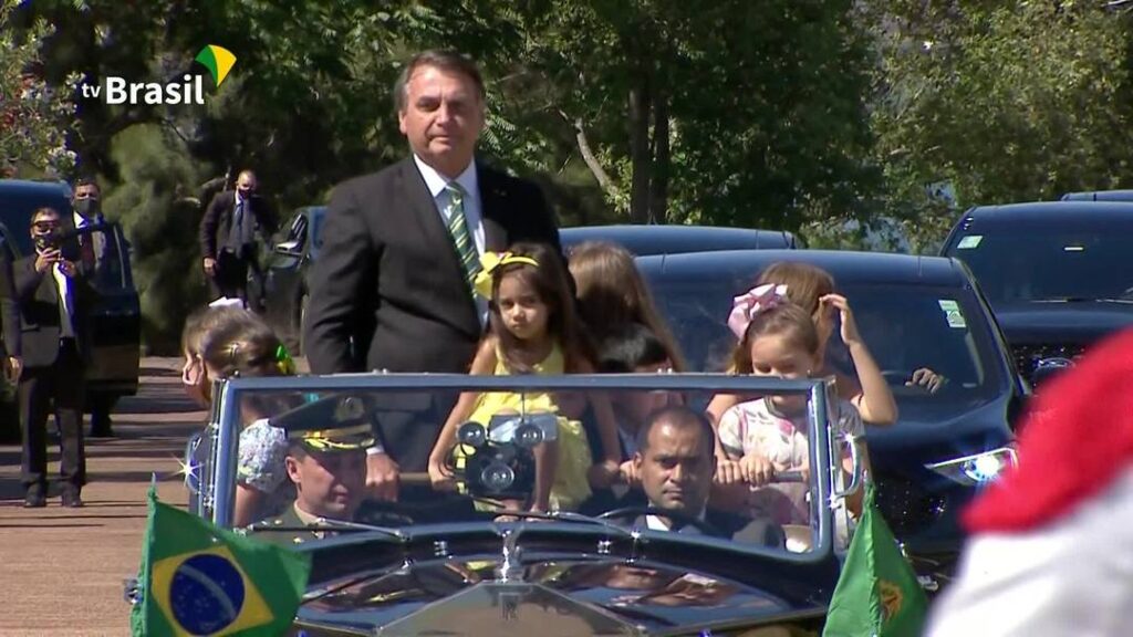 Sem máscara, Bolsonaro chegou ao local em carro aberto ao lado de pelo menos oito crianças. Apenas duas delas utilizavam o item de proteção. O Rolls-Royce (principal veículo do cerimonial da Presidência) foi acompanhado por cavaleiros do Batalhão da Guarda.