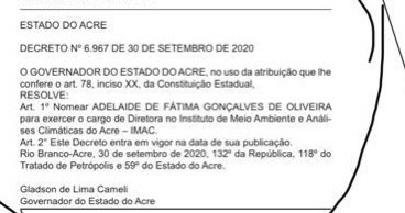 No Diário Oficial de hoje, Cameli nomeou a senhora Adelaide de Fátima Gonçalves de Oliveira para o cargo de diretora-executiva do Instituto de Meio Ambiente do Acre (Imac).