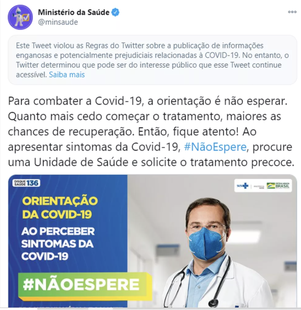 O Brasil foi o único país do mundo em que o Ministério da Saúde fez um tweet “potencialmente prejudicial” à Saúde, promovendo o tratamento enganoso: