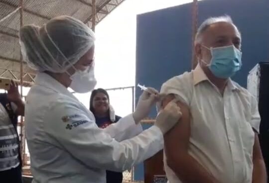 O primeiro vacinado na tarde desta terça (19) no ginásio Aurino Anute Brito após cerimônia de entrega do primeiro lote de vacinas da CoronaVac repassadas pelo governo do estado ao município de Sena Madureira foi o médio Dr. Elias Moura que já tem serviço a décadas prestados ao município.