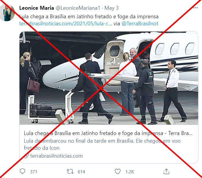 “Lula chega de jatinho fretado a Brasília e foge da imprensa”, diz o trecho de uma das publicações compartilhadas no Facebook (1, 2, 3) e no Twitter (1, 2, 3).