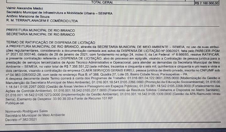 O Diário Oficial trouxe uma dispensa de licitação no valor de R$ 7,3 milhões, assinada pelo secretário municipal de Meio Ambiente, Normando Sales. É quase 10 vezes a mais do que os debatidos R$ 400 mil.