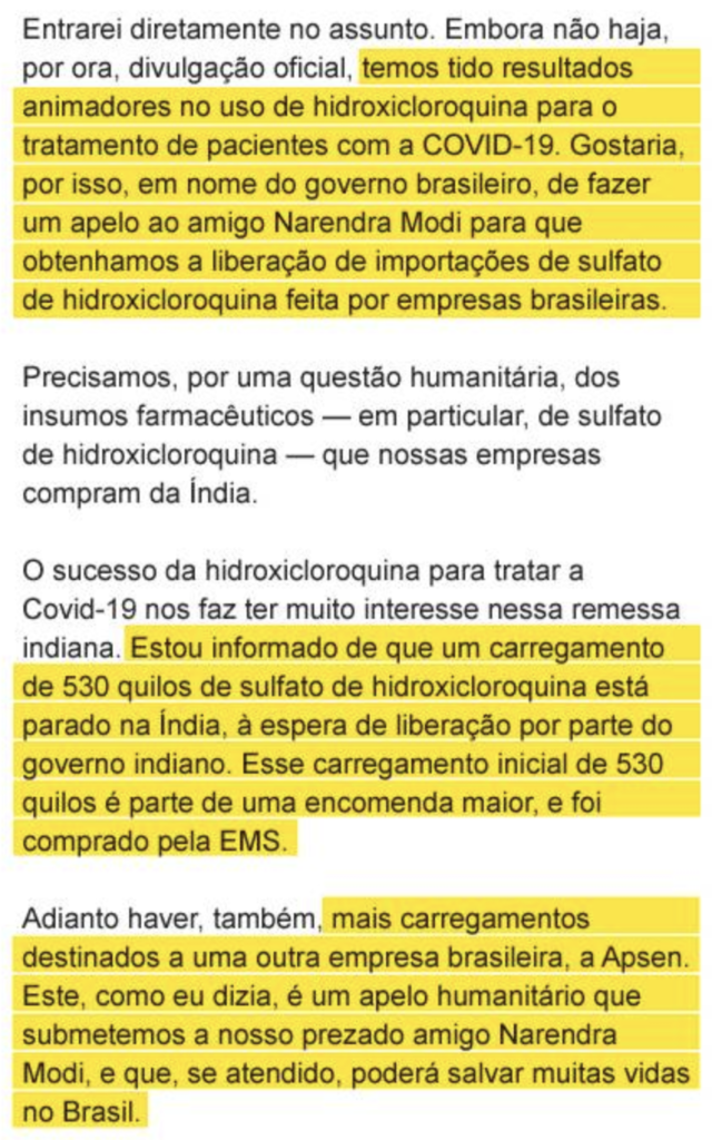 O lobby foi feito numa ligação para o primeiro-ministro da Índia, Narendra Modi, em abril de 2020.