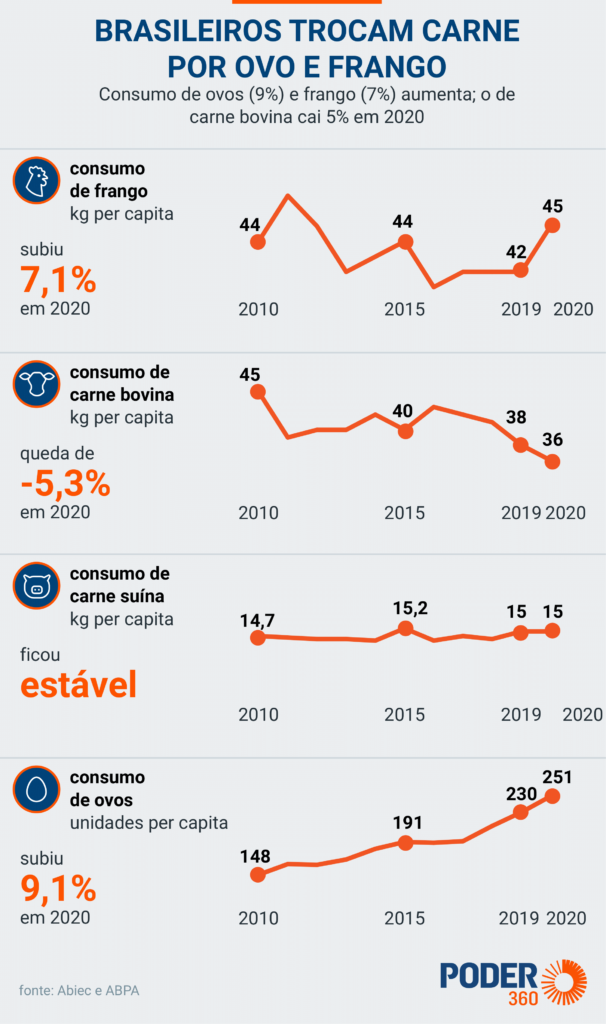 O consumo de ovos (251 unidades per capita) saltou 9% em 2020. O de frango subiu 7%, para 45 kg por pessoa. Os números são da ABPA (Associação Brasileira da Proteína Animal).
