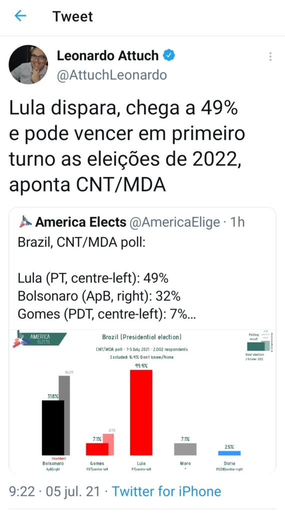 Pesquisa CNT/MDA, divulgada nesta segunda-feira (5), apontou que o ex-presidente Luiz Inácio Lula da Silva dispara na liderança da corrida presidencial, com 49% dos votos, excluindo os que não souberam ou não responderam. O petista pode ser eleito ainda no primeiro turno.