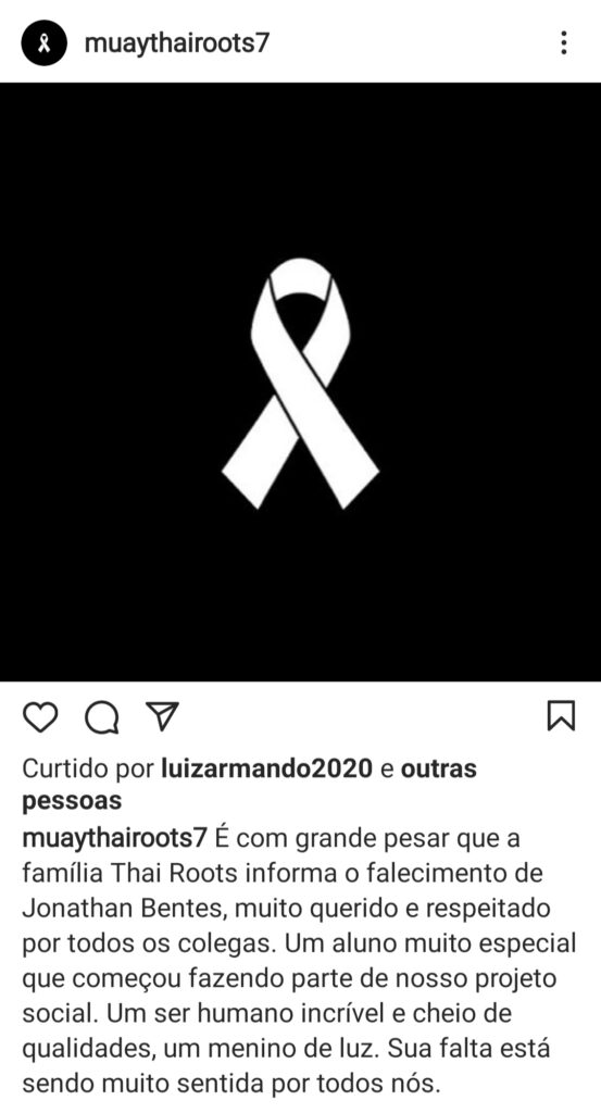 “É com grande pesar que a família Thai Roots informa o falecimento de Jonathan Bentes, muito querido e respeitado por todos os colegas. Um aluno muito especial que começou fazendo parte de nosso projeto social. Um ser humano incrível e cheio de qualidades, um menino de luz. Sua falta está sendo muito sentida por todos nós. Manifestamos nossos sentimentos e prestamos solidariedade a todos os familiares e amigos”, diz a nota.