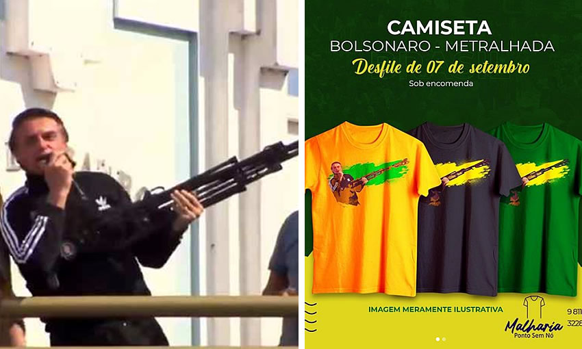 O que chama a atenção é a estampa, com desenho de Bolsonaro imitando fuzilamento com um tripé, quando estava em um carro de som na região da Gameleira. A mensagem é relacionada ao discurso do presidente da República, Jair Bolsonaro, feito quando estava em campanha eleitoral no estado em 2018. Na ocasião, o militar citou que iria ‘fuzilar a petralhada do Acre’.