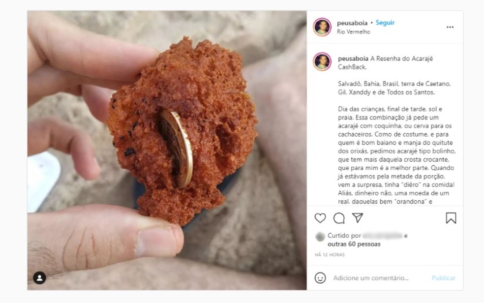 “Aliás, dinheiro não, uma moeda de um real, daquelas bem ‘grandona’ e cintilante. Na verdade, a moeda estava integrada ao bolinho, fazia parte do alimento, parecendo que tinha sido estrategicamente posicionada para dar um charme ao prato, padrão raio gourmetizador. A resenha foi imediata. Teve gente que disse que era cashback, lembrança de dia das crianças, sinal dos céus, mentira, o escambau. Quando Soteropobretano largou um “Meu Deus”, ficou claro que essa experiência tinha de ser compartilhada com os mais chegados. E está aí a foto para vocês. Isso que eu chamo de valorizar a experiência do cliente”, brincou na legenda da publicação.