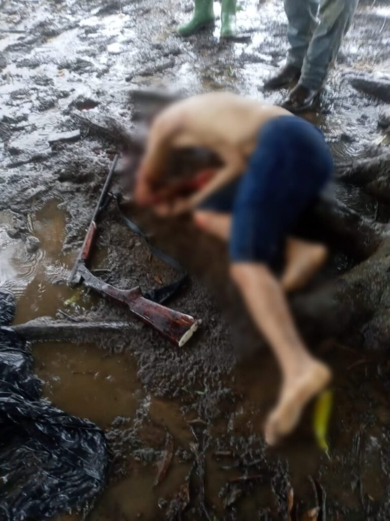 Na imagem o corpo do jovem ao lado de uma espingarda, provavelmente usada na consumação do ato.