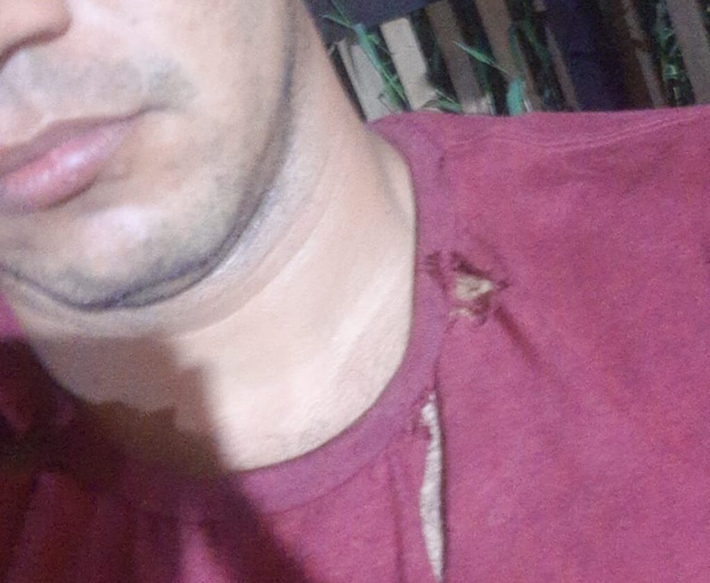 “O W. SANTIAGO alega que houve uma confusão generalizada e que na tentativa de cessar a confusão a “vitima” lhe agrediu fisicamente no pescoço, no rosto e rasgou a blusa do mesmo. Então, devido a injusta provocação houve o uso da força para cessar a injusta provocação.