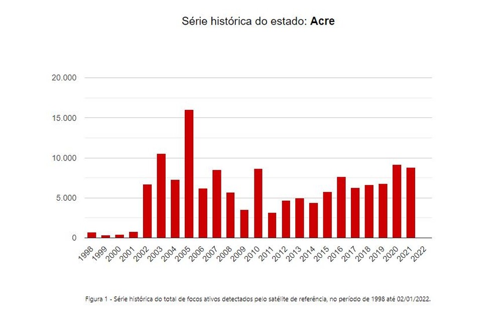 Em 2020, inclusive, foi registrado o maior número de focos de queimadas em dez anos no estado acreano. Em 23 anos, de 1998 a 2021, o maior número contabilizado no estado foi em 2005 – 15.993 focos de queimadas.