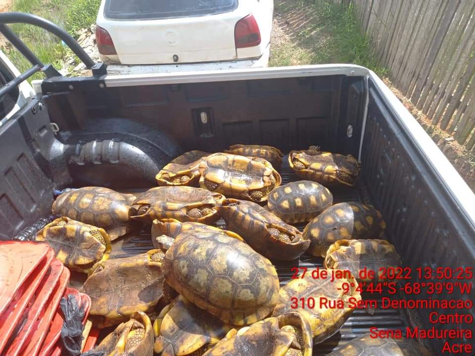 Com informações que no referido local um indivíduo mantinha vários jabutis para comercialização, a equipe policial se deslocou a zona rural de Sena Madureira para averiguar o fato. Chegando ao endereço encontrou o suposto envolvido que negou comercializar os animais, porém ao adentrar e verificar a denúncia, os militares constataram a veracidade dos fatos, encontrando ao todo 24 jabutis. O envolvido não afirmou ser proprietário de todos os animais.