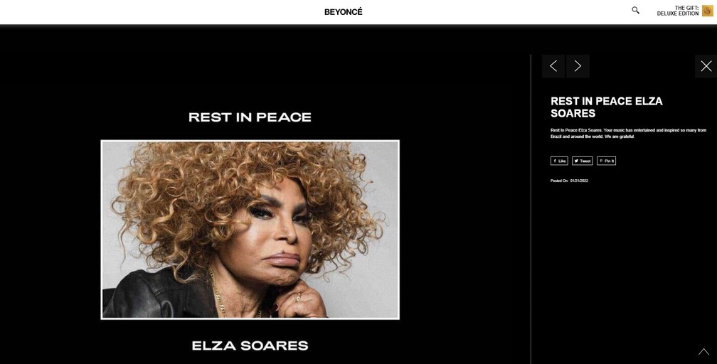 Beyoncé prestou uma homenagem a Elza Soares em seu site oficial. A cantora brasileira morreu nesta quinta-feira (20), aos 91 anos, no Rio de Janeiro.