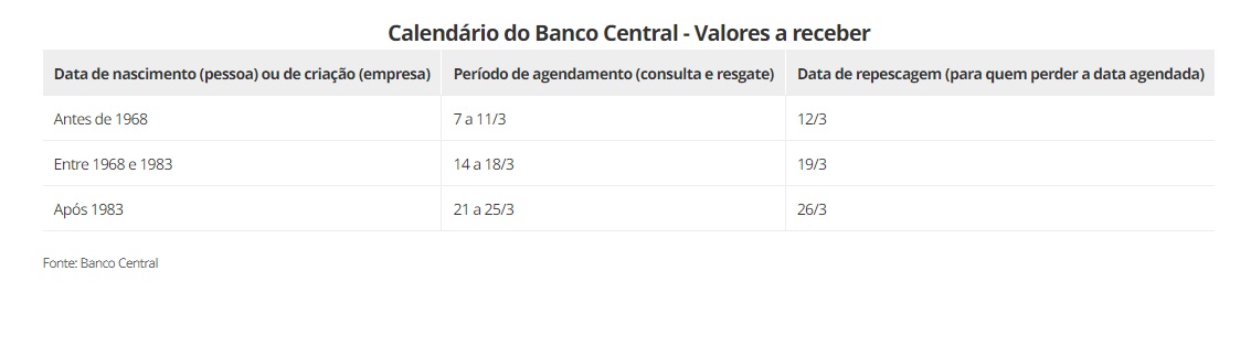 Quem perder seu sábado de repescagem, poderá consultar ou solicitar o resgate do saldo existente a partir de 28/03/2022. “Mas não se preocupe, mesmo se você não consultar ou solicitar o resgate do saldo existente em todas essas datas, ele continuará guardado à sua espera”, informa o BC