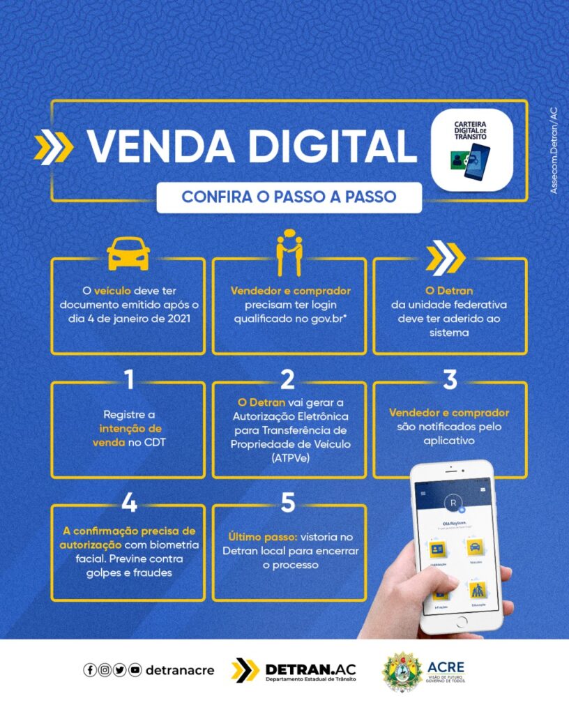 A Venda Digital é uma solução inovadora do governo federal, desenvolvida por meio de parceria entre a Secretaria Nacional de Trânsito (Senatran)/ Ministério da Infraestrutura (MInfra), Serviço Federal de Processamento de Dados (Serpro) e Detrans.