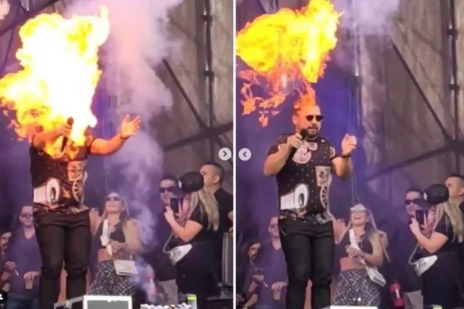 Nesta terça-feira (24/5) o cantor de forró compartilhou no Instagram imagens do momento exato quando o efeito do show foi acionado e ele queimou o braço.