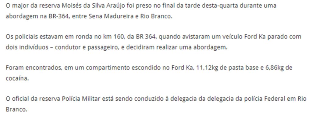 Major PM da reserva é preso com 18kg de drogas na BR 364 entre Sena/Rio Branco