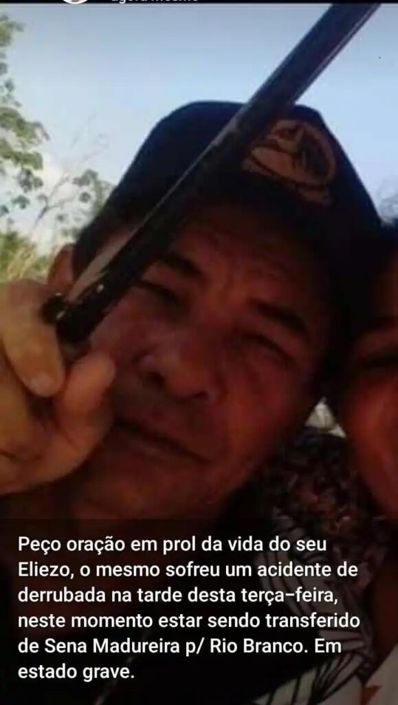 O Trabalhador identificado como Eliezo, residente no Bairro Cidade Nova, em Sena Madureira, foi vítima de um acidente de derrubada nesta terça-feira (21). Ele estava trabalhando dentro da floresta, na altura do seringal descanso, Rio Purus.