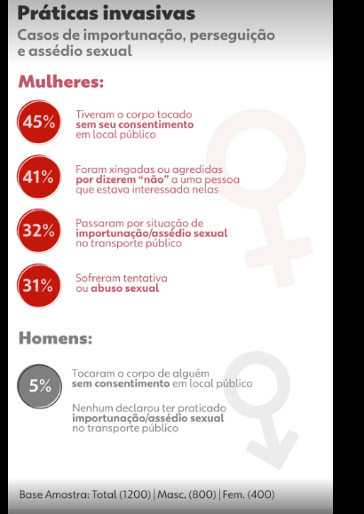 O estudo apontou também que, em relação às práticas invasivas — importunação, perseguição e assédio sexual — 41% das brasileiras já foram xingadas ou agredidas por dizerem “não” a uma pessoa que estava interessada nelas, 32% delas afirmaram ter passado por situação de importunação ou assédio sexual no transporte público e 31% declararam que já sofreram tentativa ou abuso sexual.