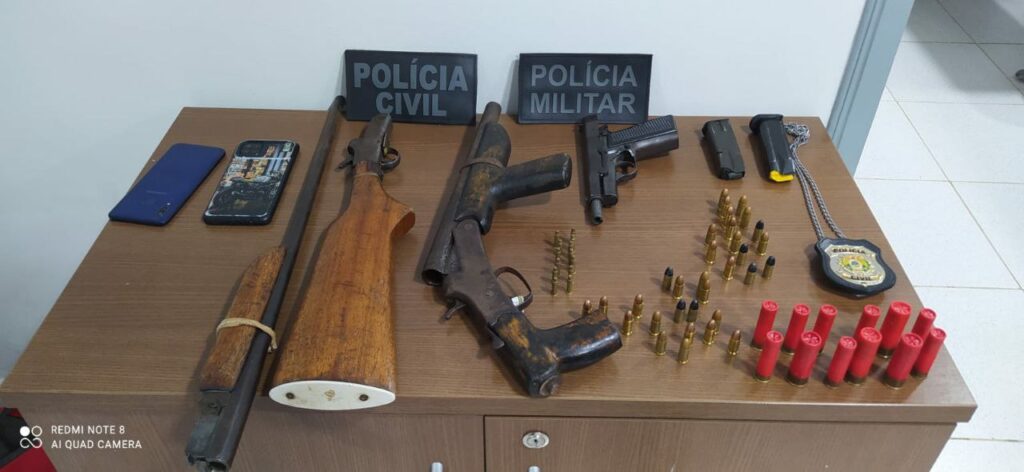 A Polícia Militar, por meio do 8° BPM, atraves do 1° Pelotão da cidade de Manoe Urbano logrou êxito na apreensão de 03 armas de fogo e a prisão em flagrante de duas pessoas.