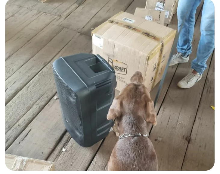 Após trabalho do cão policial Duke, foi possível identificar uma encomenda que continha uma caixa de som, cujo interior estava recheado de entorpecente.