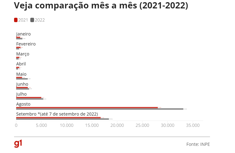 Segundo o Instituto Nacional de Pesquisas Espaciais (Inpe), o bioma registrou 18.374 focos de incêndio entre 01 e 07 de setembro de 2022. Em 2021, foram 16.742 focos no mês inteiro – um aumento de quase 10%.