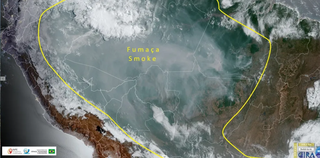 A “nuvem” de fumaça provocada pelas queimadas se espalha pelo Brasil há dias, atingindo países vizinhos. Uma imagem do satélite geoestacionário Goes-16 mostrou, na segunda-feira (5), a dispersão do rastro de fumaça atingindo o Acre, Amazonas, Rondônia, Roraima, Mato Grosso e Pará. Na quarta-feira (7), a fumaça atingiu São Paulo, Paraná e Bolívia.