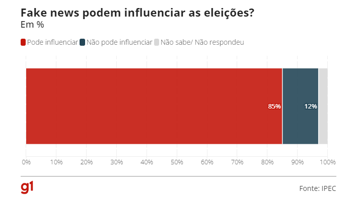 Dados da pesquisa Ipec encomendada pela Globo, divulgados nesta terça-feira (6), apontam que a grande maioria dos eleitores brasileiros (85%) acredita que as fake news podem impactar na eleição deste ano.