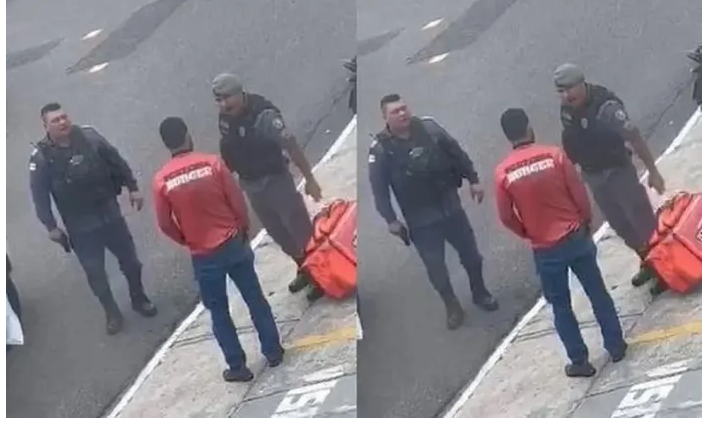 Nas imagens, é possível ver quando um dos PMs solicita documentos ao entregador com gritos e palavrões, enquanto um segundo agente aparece segurando uma arma.