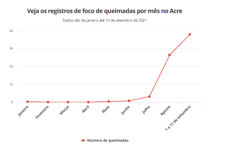Conforme os dados do Instituto Nacional de Pesquisas Espaciais (Inpe), entre o dia 1 e 11 de setembro foram registrados 3.794 focos de queimadas em todo o estado. Essa quantidade supera todos os registro do mês de agosto, que foram 2.638 e representa 43,8% do total do registrado em todo ano até agora, já que de janeiro a 10 de setembro, o Acre tem 6.882.