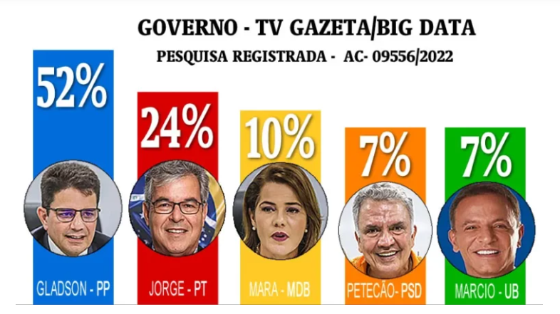 O Instituto Real Time Big Data, contratado pela TV Gazeta/Rede Record, divulgou nesta terça-feira, 13, os números das intenções de votos para a disputa do governo do Acre nas eleições de 2022. De acordo com a pesquisa estimulada, o atual governador e candidato à reeleição Gladson Cameli (PP) aparece na liderança com 45%, seguido pelo candidato petista Jorge Viana, com 21%. Na terceira posição surge Mara Rocha (MDB) com 9% e Márcio Bittar (UB) e Sérgio Petecão (PSD), com 6%, cada um. Os professores David Hall (AGIR) e Nilson Euclides (PSOL) não pontuaram. 5% marcaram nulo ou branco e não sabem ou não responderam registrou 8%.