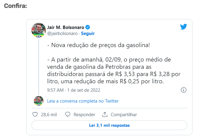 No mesmo momento em que a Petrobras anunciava a queda no preço, Bolsonaro publicou a notícia em sua conta do Twitter.