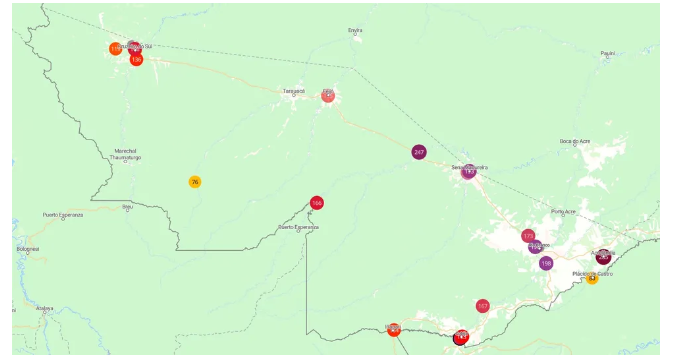 Entre as cidades acreana, o recorde segue com Feijó com 32% dos focos de todo estado, ao registrar 576 focos. Logo depois vem Tarauacá com 253 e a capital Rio Branco com 151.