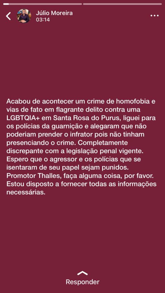 “Eu repudio veementemente esse tipo de conduta criminosa. Mesmo com tantas leis protecionistas à LGBTQIA +, ainda assim, nos deparamos em nossos cotidianos com esses casos. Principalmente em cidades do interior, onde esses crimes são velados e os praticantes agem de forma como se fossem “normais”.