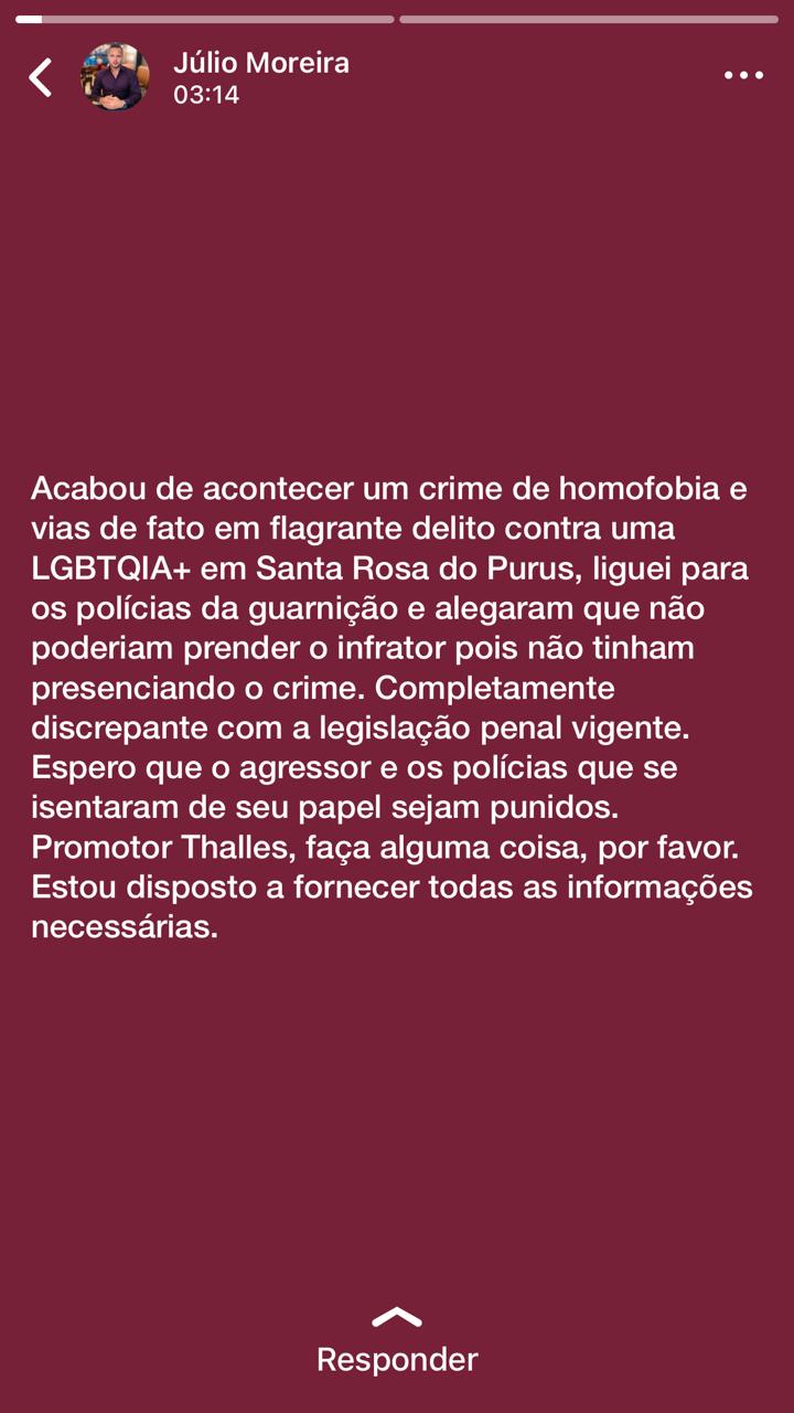 Um crime de lesbofobia com agravante de agressão física foi registrado contra a jovem Yasmim Witória, no município de Santa Rosa do Purus, no interior do Acre, na noite desta sexta-feira (7). O caso foi relatado pelo advogado da vítima, Júlio Moreira, nas redes sociais, onde ele afirmou ter ligado para a guarnição da polícia, que alegou não ter como prender o agressor, pois não havia presenciado o crime.