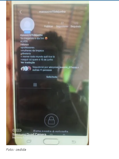 O alvo, de acordo com o perfil criado, seriam “alunos, professores, mulheres da limpeza, diretoria”. Na descrição ainda especifica que deve “morrer todo mundo quê tive lá. Seguir só quem é 15 de junho”, afirma perfil.