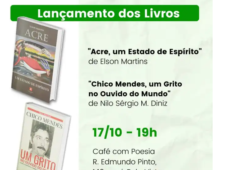 A literatura amazônida recebe mais um reforço. Os livros “Acre: um estado de espírito”, do jornalista Elson Martins, e “Chico Mendes: um grito no ouvido do mundo”, do sociólogo Nilo Diniz, têm lançamento marcado para Rio Branco nesta segunda-feira (17) às 19h, no Café com Poesia, com entrada gratuita.