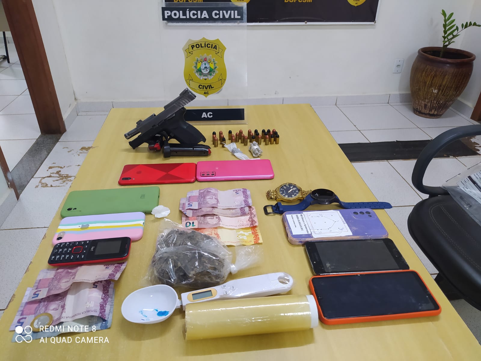 Em posse dos investigados a Polícia Civil apreendeu uma pistola Cal. 380 com numeração suprimida, munições e ainda várias porções de maconha.