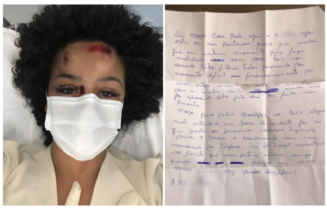 Uma jovem de 26 anos saltou de um carro em movimento por acreditar que seria sequestrada e estuprada por um motorista de aplicativo, em Goiânia. A designer de unhas Walirrane Ramos contou ao g1 que ficou com medo após o homem fazer diversas perguntas. Depois de pular do carro, ela teve diversos ferimentos. No dia seguinte, o condutor teria enviado uma carta para ela pedindo desculpas (veja bilhete acima).