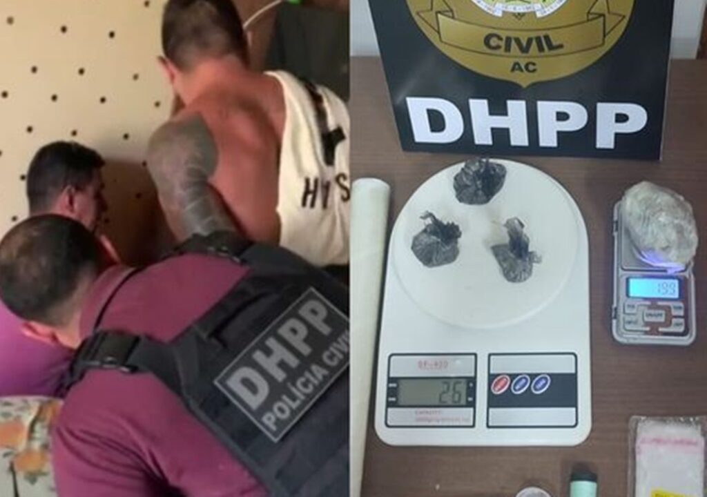 Em posse do foragido, a Polícia Civil apreendeu uma quantidade entorpecentes e material para embalagem da droga e venda.