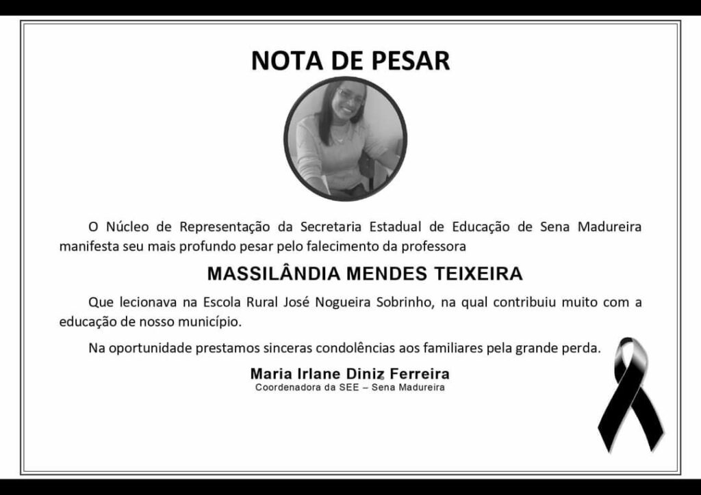 O Núcleo de Educação do Estado em Sena Madureira publicou nota de pesar pela perca da profissional que acabou pegando todos de surpresa.