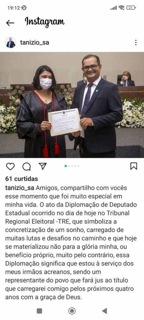 Em postagem em sua página no Instagram, Tanízio se diz muito grato a todos pela oportunidade e promete fazer um mandato voltado realmente a população acreana.