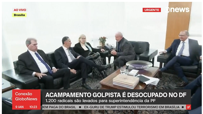 A reunião foi realizada no gabinete de Lula, no terceiro andar do Planalto. O gabinete não foi invadido pela minoria de bolsonaristas radicais envolvida nos atos de terrorismo.