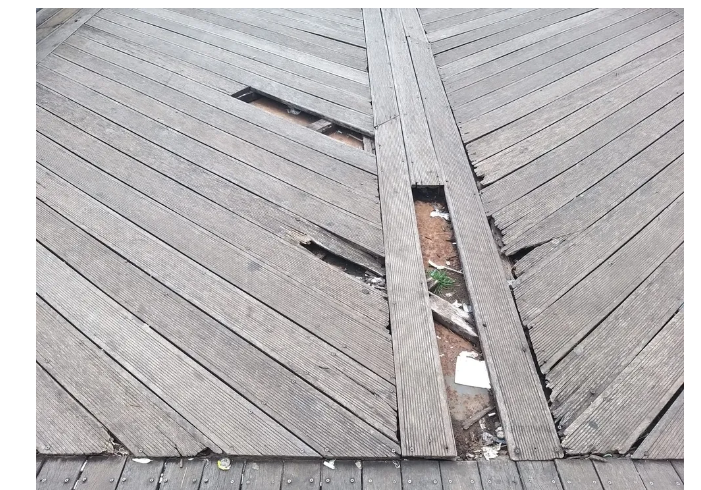 Segundo Falcão, foram encontrados danos tanto na parte em madeira quanto na parte metálica da passarela. Não há risco imediato de desabamento, mas a Defesa Civil solicitou manutenção aos órgãos competentes. Caso a manutenção não seja feita logo, a Defesa Civil deve pedir a interdição do espaço.