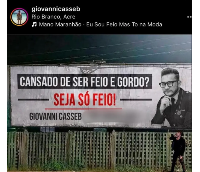 “Cansado de ser feio e gordo? Seja só feio!”. A frase faz parte de uma montagem inserida digitalmente em um outdoor com o nome, contato e foto do médico. Ele postou uma foto que mostra o falso outdoor e ele logo abaixo com a mão na boca olhando para cima.