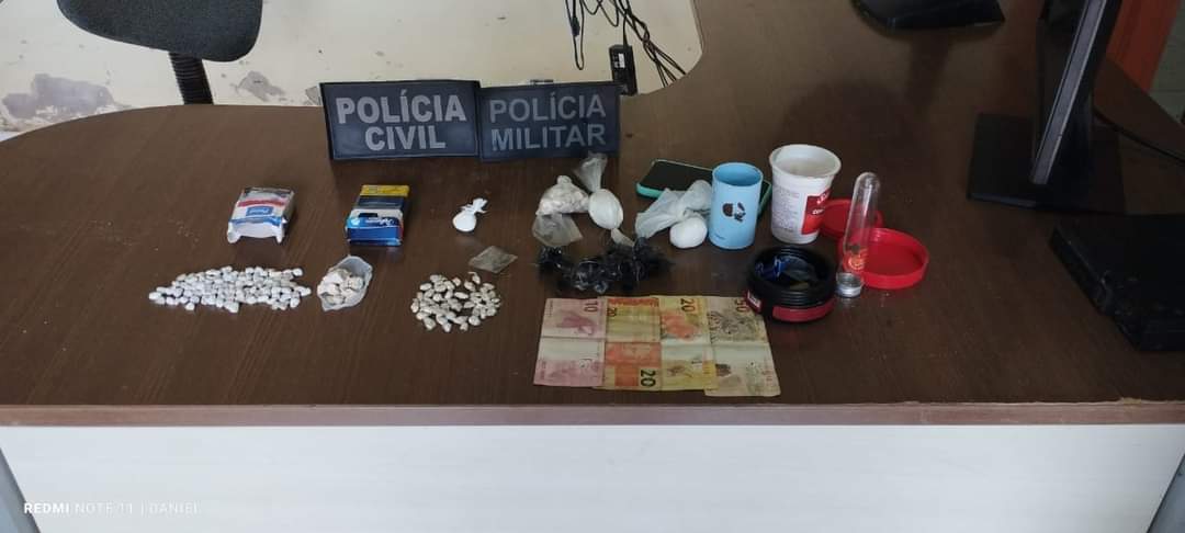 Os policiais se deslocaram até o endereço indicado e realizaram a abordagem aos suspeitos. Durante buscas e averiguação em um terreno baldio, local onde os suspeitos escondiam a substância ilícita, os policiais localizaram aproximadamente 38 (trinta e oito) gramas de uma substância aparentando ser crack e 48 (quarenta e oito) gramas de uma substância aparentando ser cocaína, 1 (um) tablete de uma substância escurecida aparentando ser maconha e 100,00 (cem) reais.