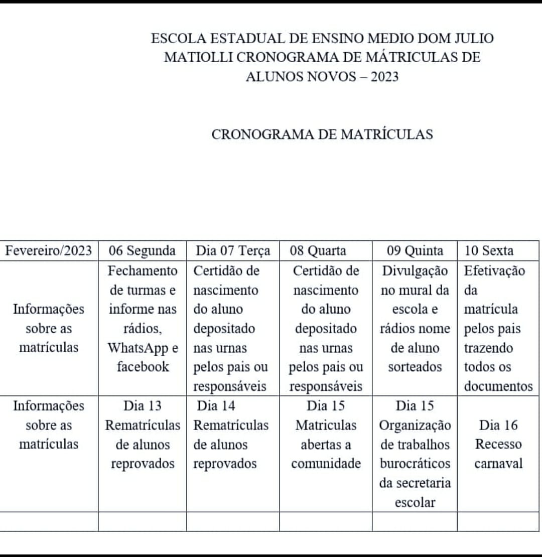 A Escola Estadual de Ensino Médio Dom Júlio Mattioli, divulgou o cronograma de matrículas de alunos novos para o novos de 2023.